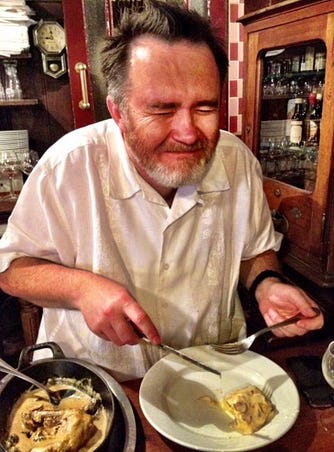 At the 16:00 mark, Bourdain and Bill Buford dine at Café Comptoir Abel, the city’s oldest bistro, where Bourdain tastes a classic Lyonnaise dish: quenelles, a dish made of filleted river pike inside a soft dumpling, coated in a sauce of béchamel made with crawfish butter. Because of the Bourdain episode, I visited Lyon in 2015 with friends, including the incomparable James C. We made our way to Café Comptoir Abel, and I ordered the quenelles. James C. captured the very moment I tasted what was one of the best meals of my life: