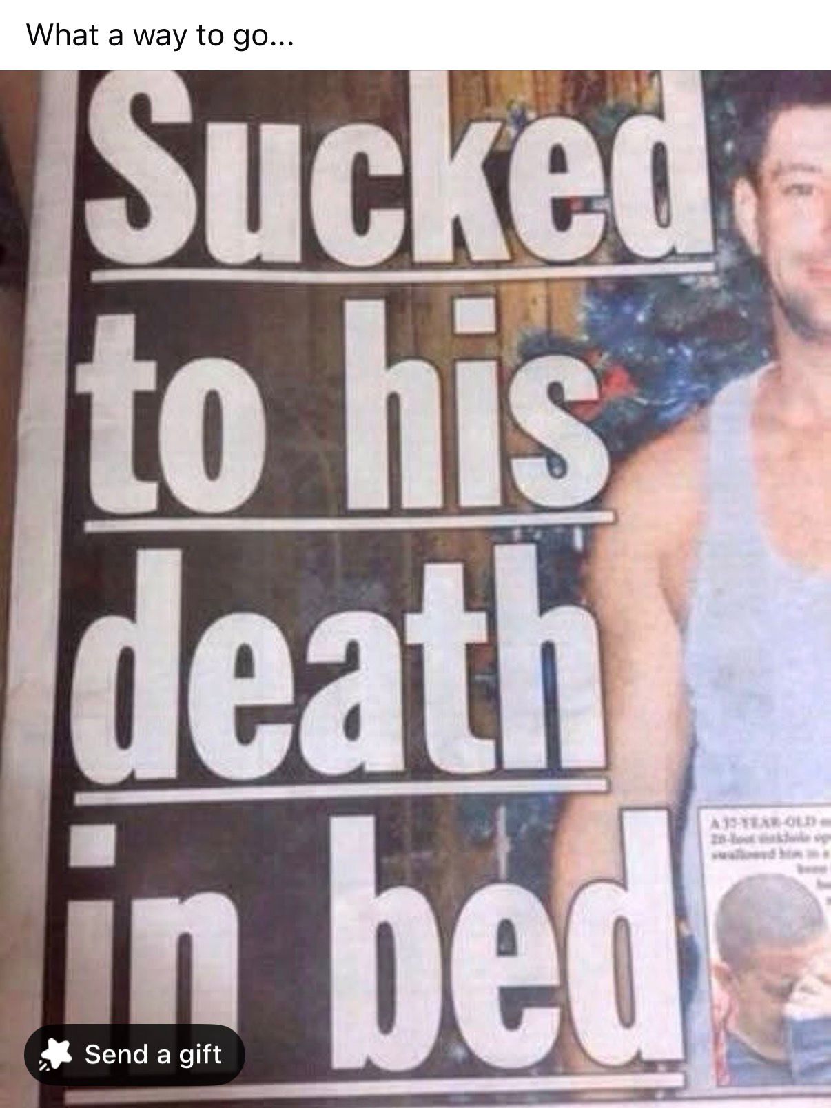 Well, if you have a strong stomach, here’s a story from Wales about Darren Meah-Moore, a well-known (as in, was once on RuPaul’s Drag Race) local drag queen was found dead, in full drag, after a night of sexual debauchery that ended with him having sex with a number of men in a local park. One of the men was a gay bloke out walking his dog late at night, and who took advantage of the opportunity to pleasure himself with Meah-Moore … until the dog joined in, and the dog-walker lost interest. Meah-Moore instructed his insta-lover to leave the tumescent dog alone. The coroner found sexual, um, residue from both man and beast inside Meah-Moore’s body.