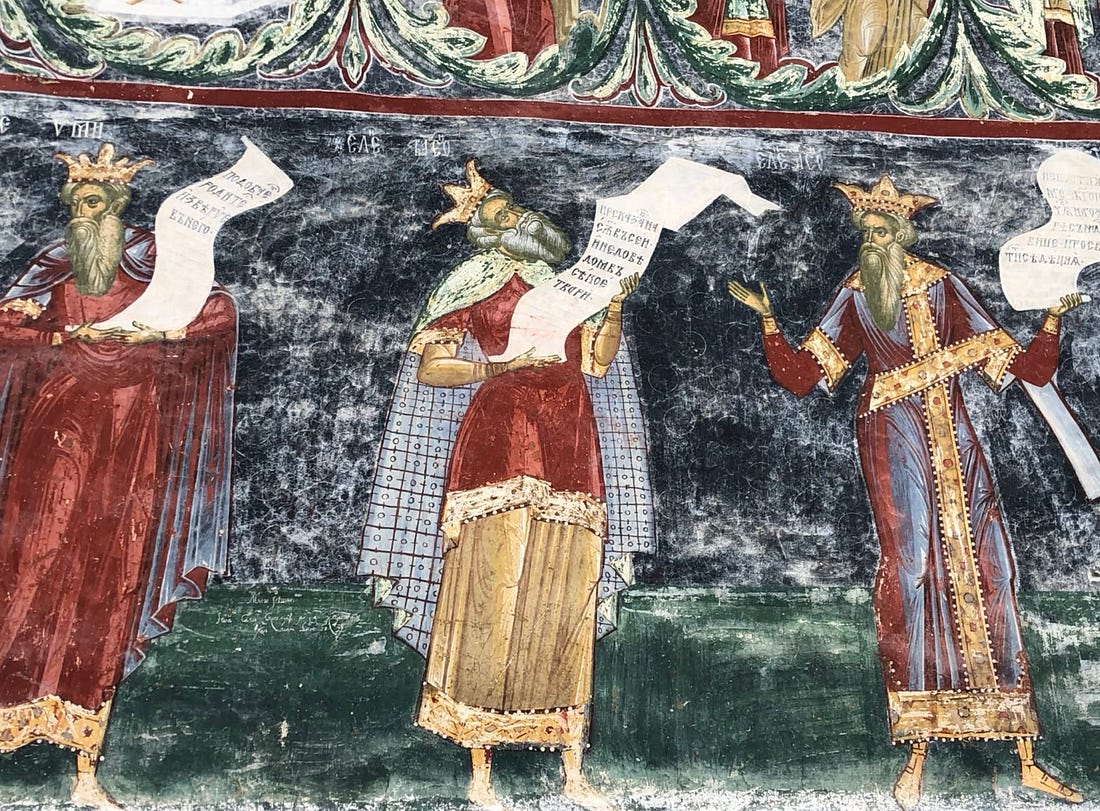In 2022, when I visited the medieval Orthodox monasteries in northern Romania, I noticed at the base of one of the painted churches images of kings. The monk guiding me told me that those are the pre-Christian Greek philosophers who opened the way, conceptually, for Christ.