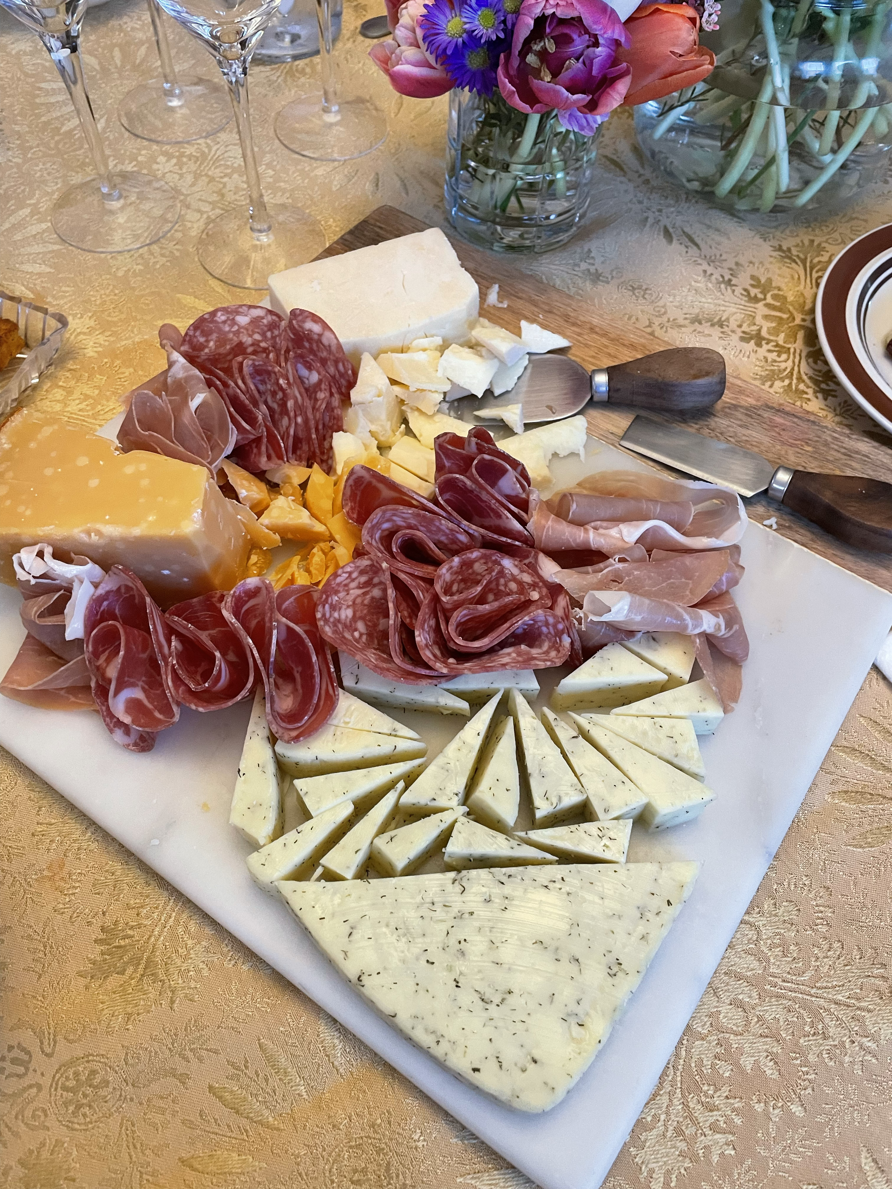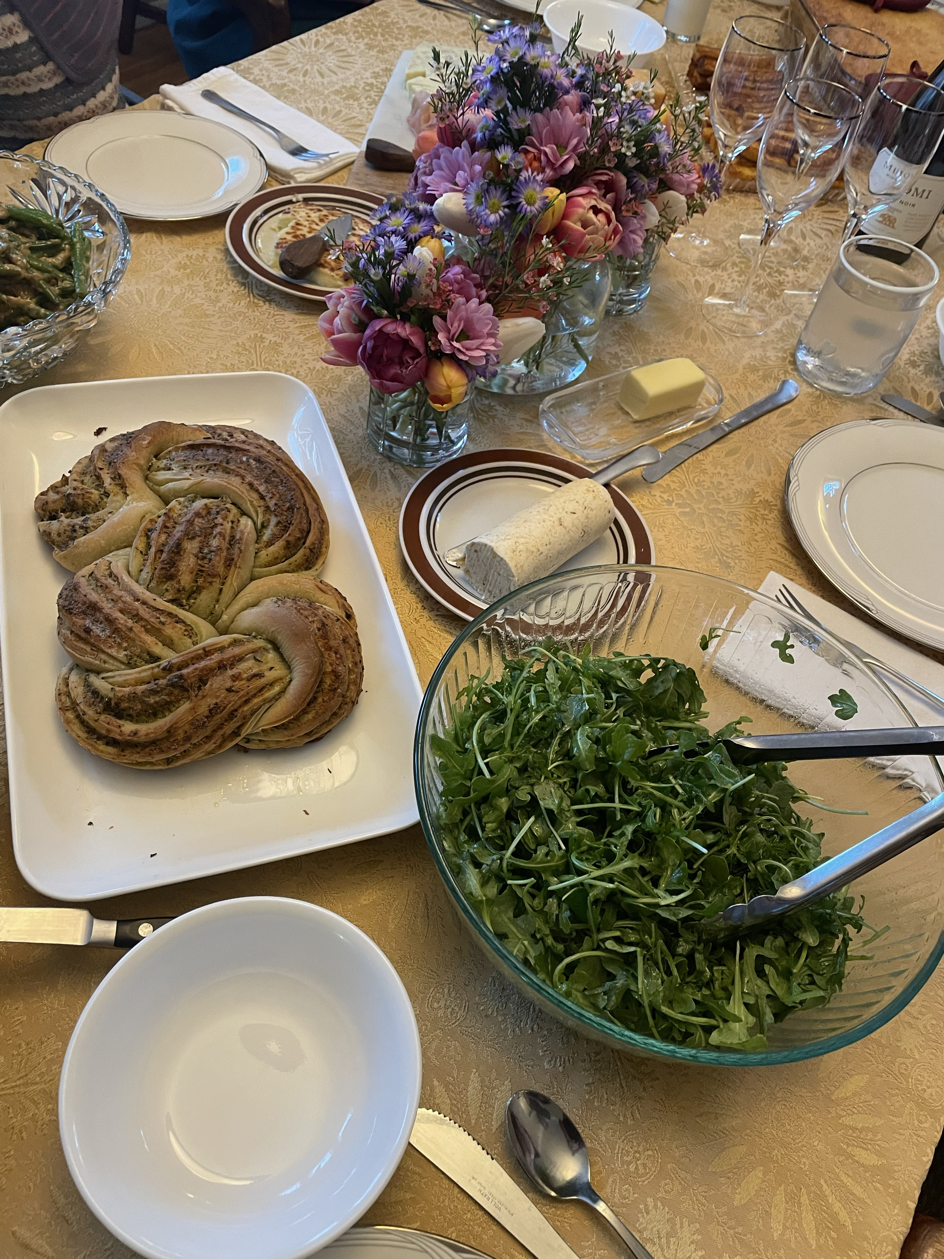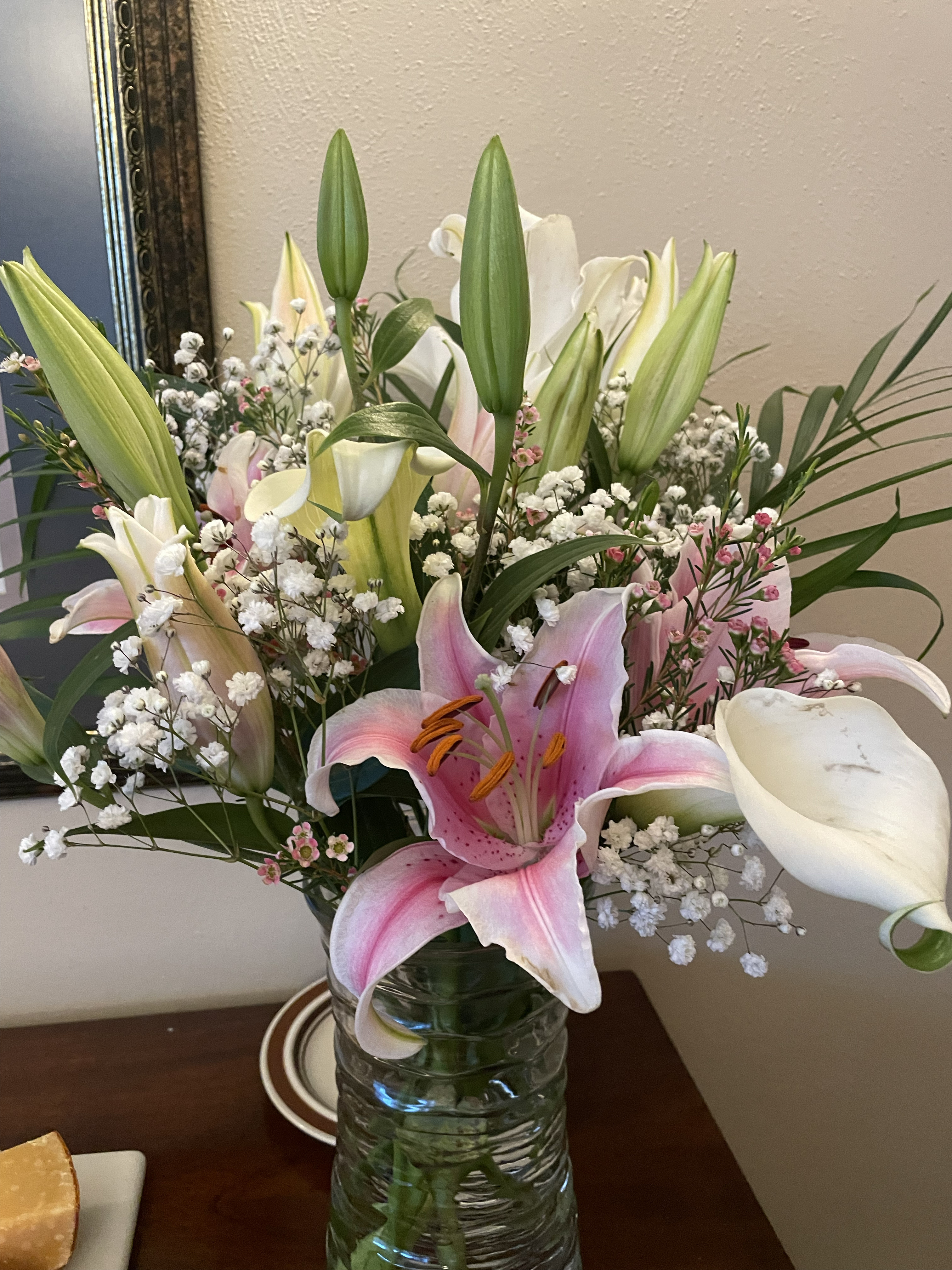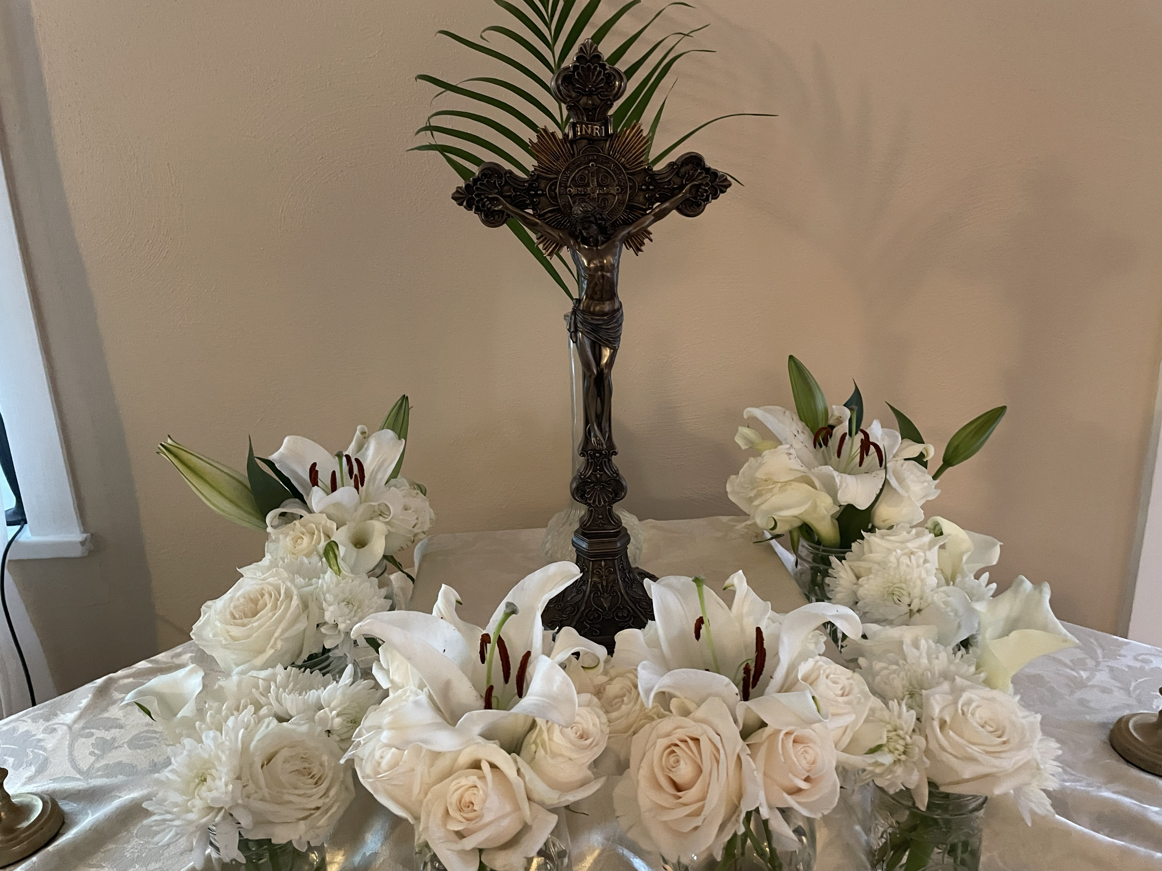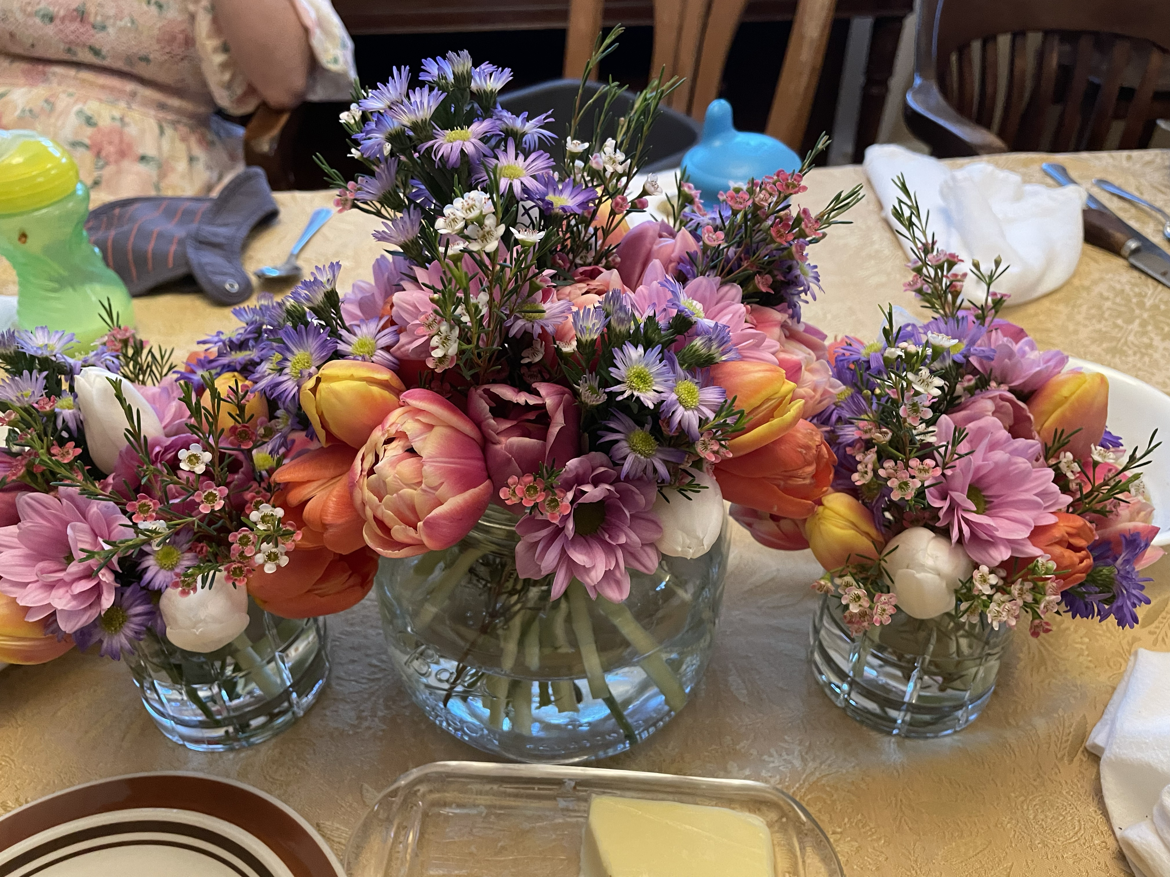 (flower arrangements courtesy of the daughter. Dishes courtesy of the daughter and daughters-in-law)
